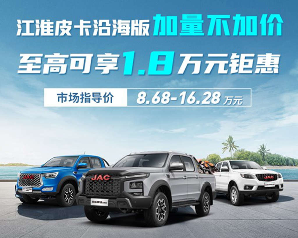 沿海地域の車は、高塩分、高湿度、高温度などの海洋性気候環境に直面しており、防腐性能に対して非常に高い要求が求められます。品質を向上させながら価格を据え置き、防腐の新たな高みをリードする江淮ピックアップ沿海特別仕様車が栄誉ある登場を果たしました。価格帯は8.68万元から16.28万元で、さらに乗り換え特典、金融特典、サービス特典、インテリジェントコネクト特典、エリート特典が加わり、最大1.8万元の大幅な割引が享受できます。